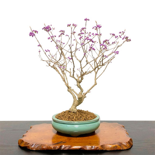 La callicarpa es un árbol de hoja caduca originaria de China, Japón y Manchuria muy valorado como bonsái por sus frutos en forma de pequeñas bayas como perlas color moradas que le dan un aspecto especial cuando está desnudo de hojas unicamente con esos pequeños frutos colgando de sus ramas.